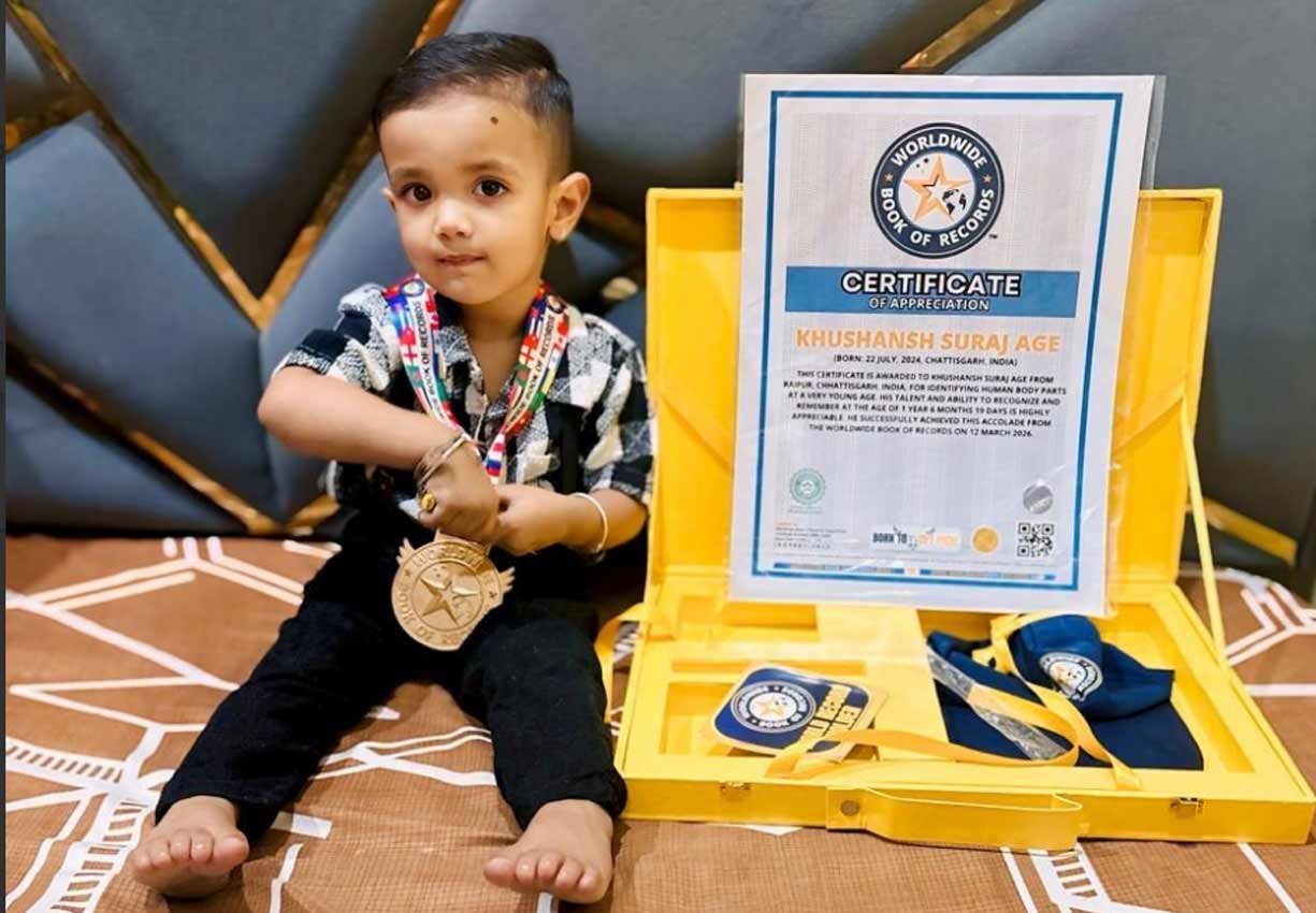 रायपुर, 2 अप्रैल 2026। प्रतिभा उम्र की मोहताज नहीं होती, इस कहावत को छत्तीसगढ़ की राजधानी रायपुर के एक नन्हे बालक ने सच कर दिखाया है। रायपुर के गुढियारी भारत माता चौक जनता कालोनी निवासी सुरज प्रमोद आगे और रूबी सुरज आगे के बेटे ( मात्र 1 वर्ष 6 माह और 19 दिन के मासूम) खुशांश सुरज आगे ने अपनी विलक्षण बुद्धि और असाधारण याददाश्त के दम पर अंतरराष्ट्रीय स्तर पर अपनी पहचान बनाई है। खुशांश की इस उपलब्धि ने न केवल उनके माता-पिता, बल्कि पूरे प्रदेश को गौरवान्वित किया है।