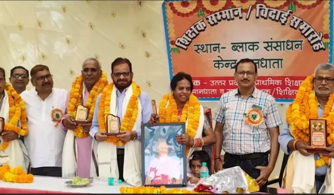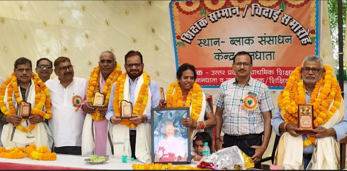 प्रतापगढ़, 16 अप्रैल 2026। मांधाता स्थित प्राथमिक विद्यालय परिसर में 15 अप्रैल को सेवानिवृत्त शिक्षकों का सम्मान किया गया। कार्यक्रम की अध्यक्षता पूर्व प्रधान मदन गोपाल ने किया। उत्तर प्रदेशीय प्राथमिक शिक्षक संघ के पूर्व जिला अध्यक्ष रमाशंकर शुक्ल मुख्य अतिथि, विकासखंड शिवगढ़ के अध्यक्ष सत्य प्रकाश पांडेय और प्राथमिक शिक्षक संघ के जिला मंत्री विनय सिंह विशिष्ट अतिथि के रुप में उपस्थित रहे।